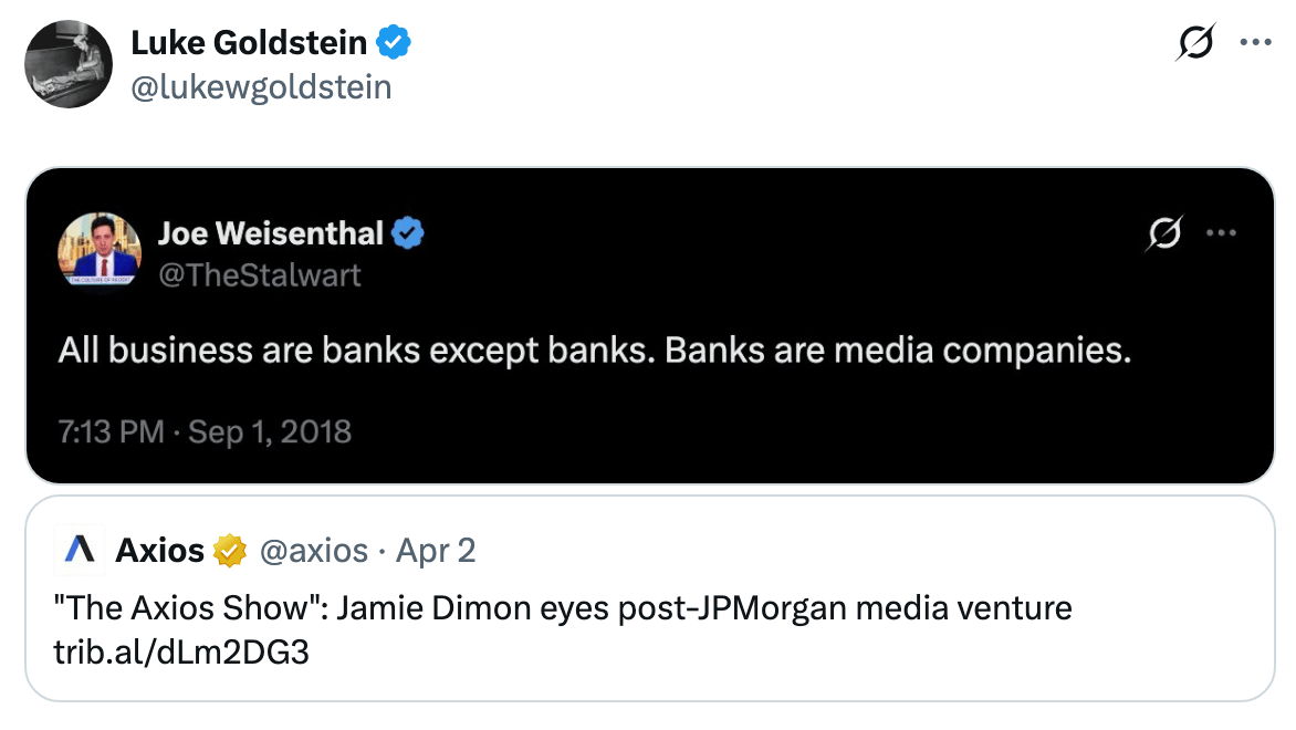 Trump 'praised Allah' in Easter day threats against Iran, Musk is requiring SpaceX's IPO advisors to use Grok, Bill Ackman is seeking our advice on Twitter, Jamie Dimon is eyeing a media venture post-JPMorgan, KKR raised its largest buyout fund ever, OpenAI acquired TBPN, multi-strats got hammered in March, and Citrini Research sent an analyst to the Strait of Hormuz to report live from the scene.