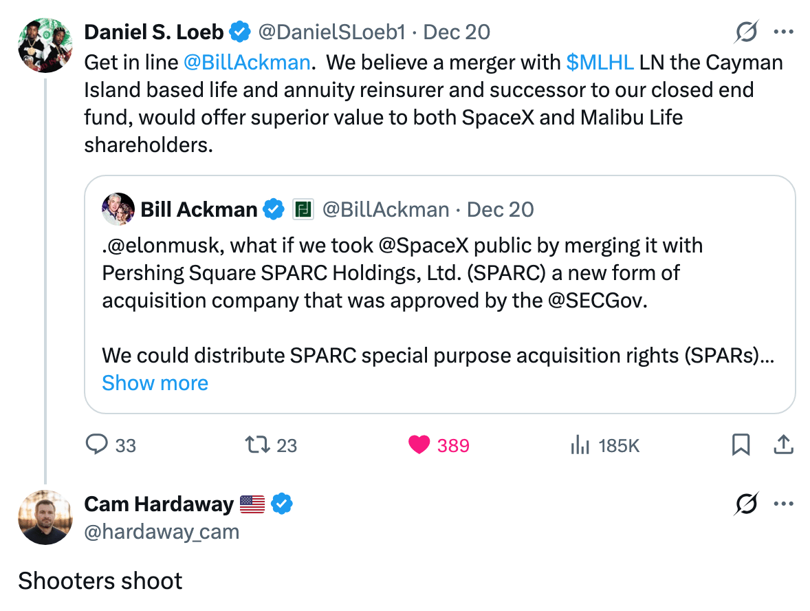Bill Ackman's hedge fund Pershing Square proposed merging SpaceX with Pershing Square SPARC Holdings, a special purpose acquisition rights vehicle that would give Tesla shareholders priority access to invest in SpaceX