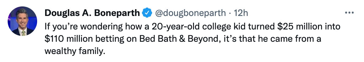 Remember the kid from yesterday who made $100M+ on his BBBY purchase? He's back again, with penny stock MindMed soaring on the news that he owns some shares. Retail degens gonna degen.