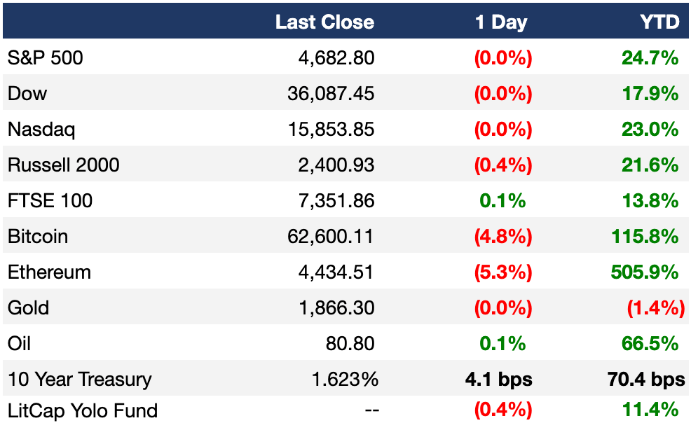 Biden signed the $1T infra bill into law yesterday, stocks held steady, crypto sold off last night, and Elon Musk unloaded another $930M in Tesla stock after selling $6.9B last week.