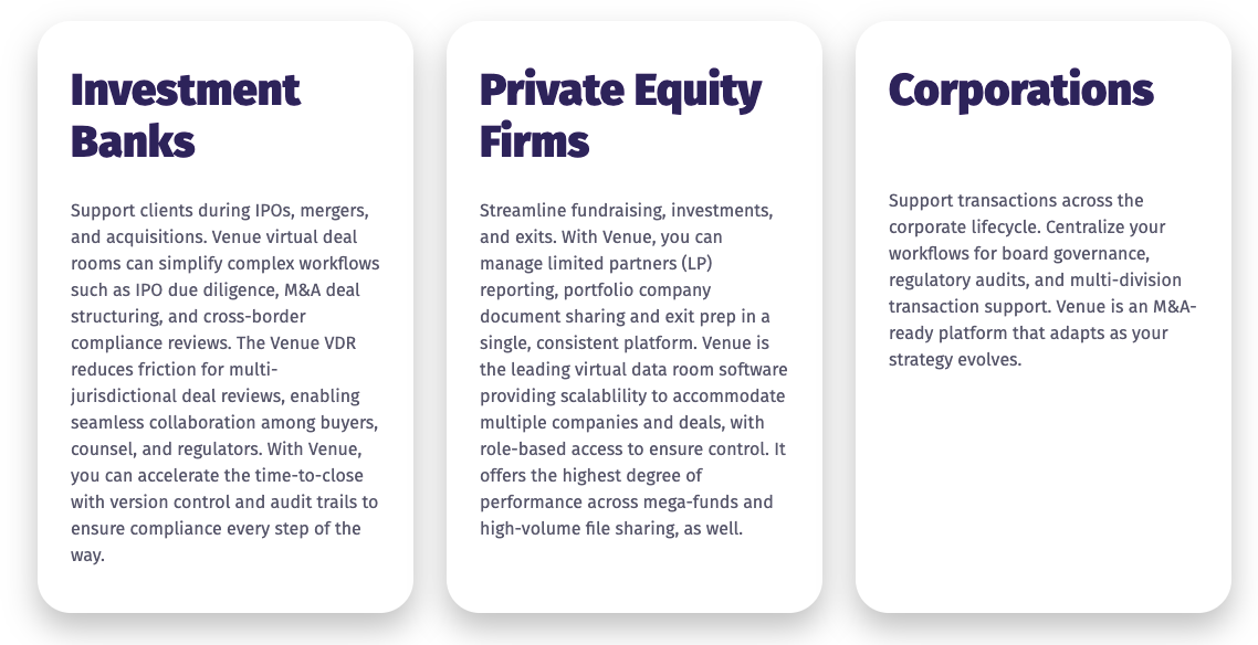Venue (their VDR product) is interesting though, because it has been rebuilt from the ground up, based on direct client input, making it the most modern VDR on the market. What better way to build a product used by deal makers, than to ask them what they really need and care about most?