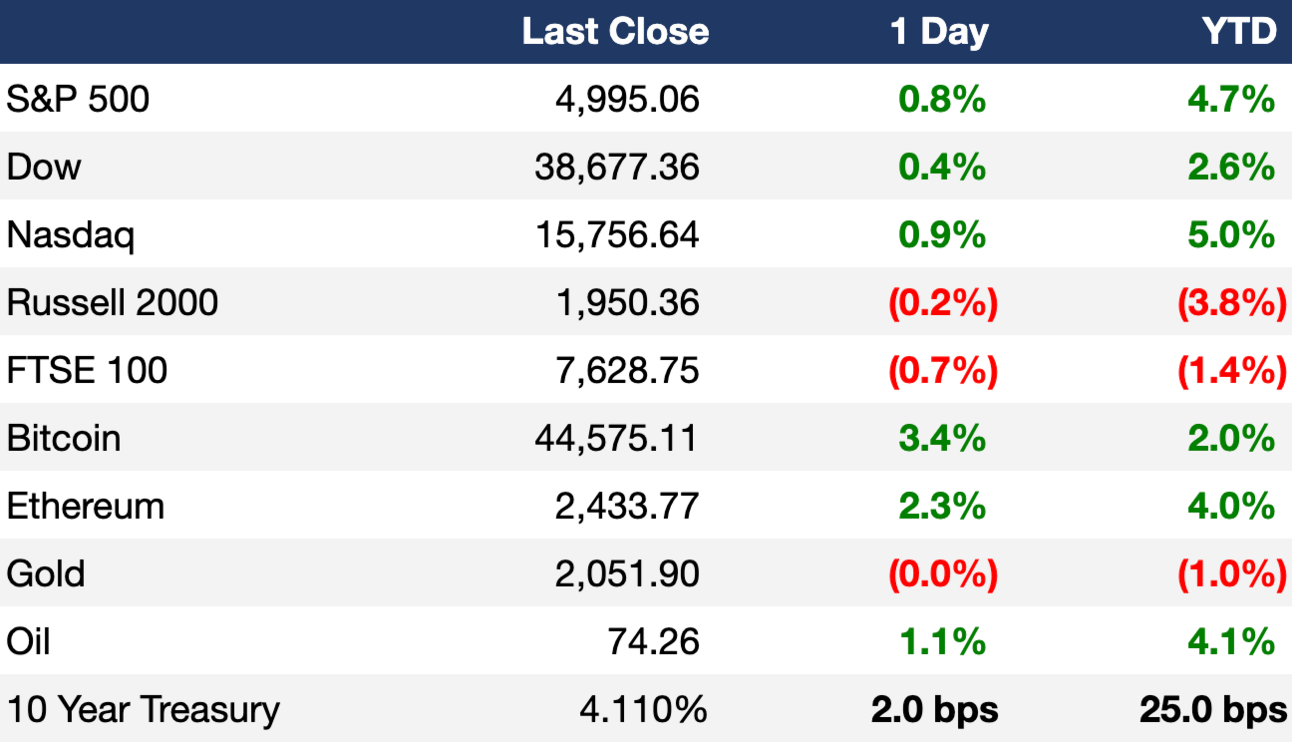 - Disney shares jumped ~7% after beating Q1 earnings expectations and hiking 2024 profit guidance thanks to cost-cutting; the media giant missed on revenue, which was almost flat YoY (CNBC)