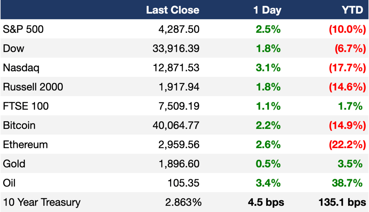Markets rebounded yesterday with all three major averages closing in the green following a strong earnings report from Meta