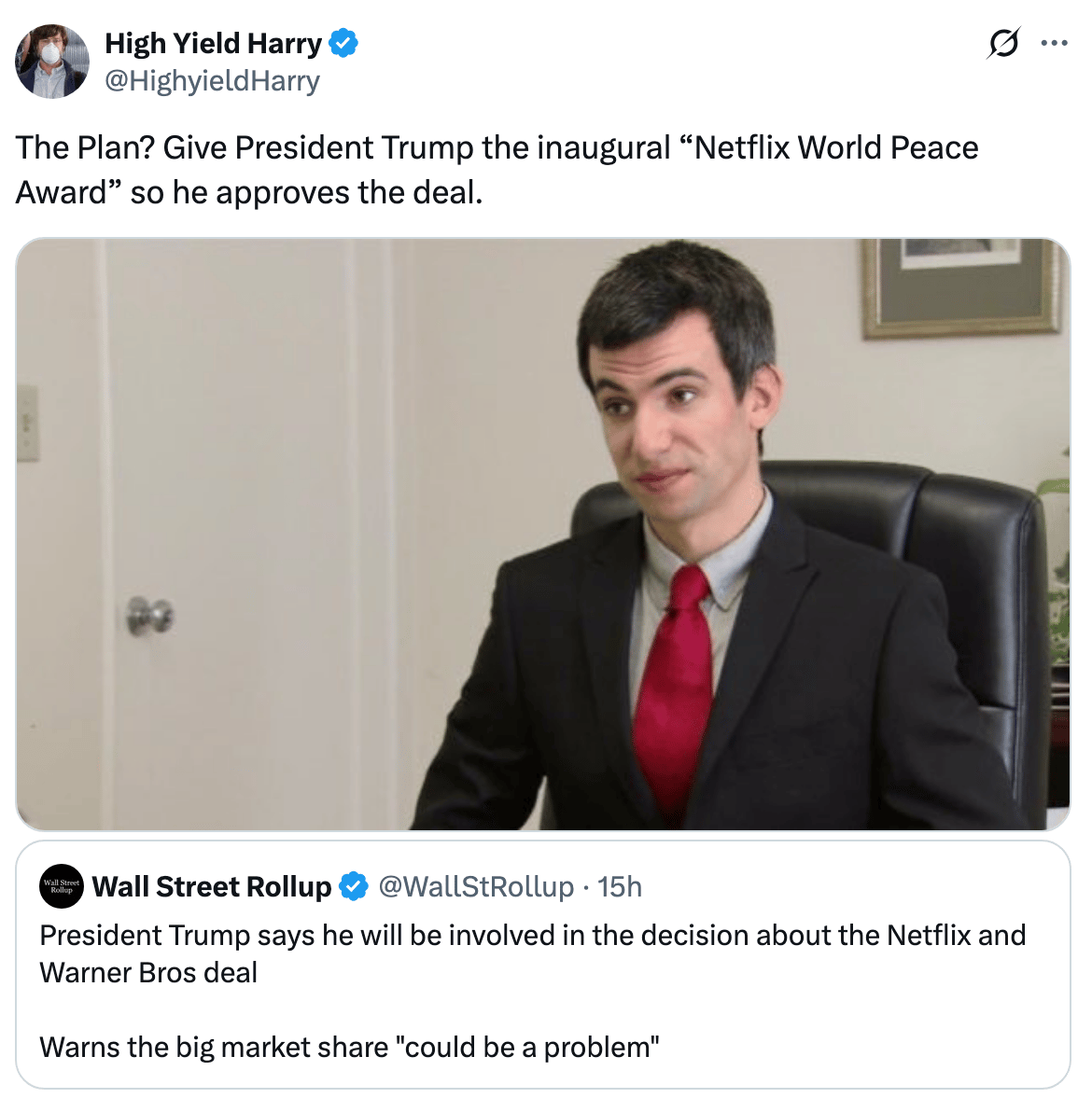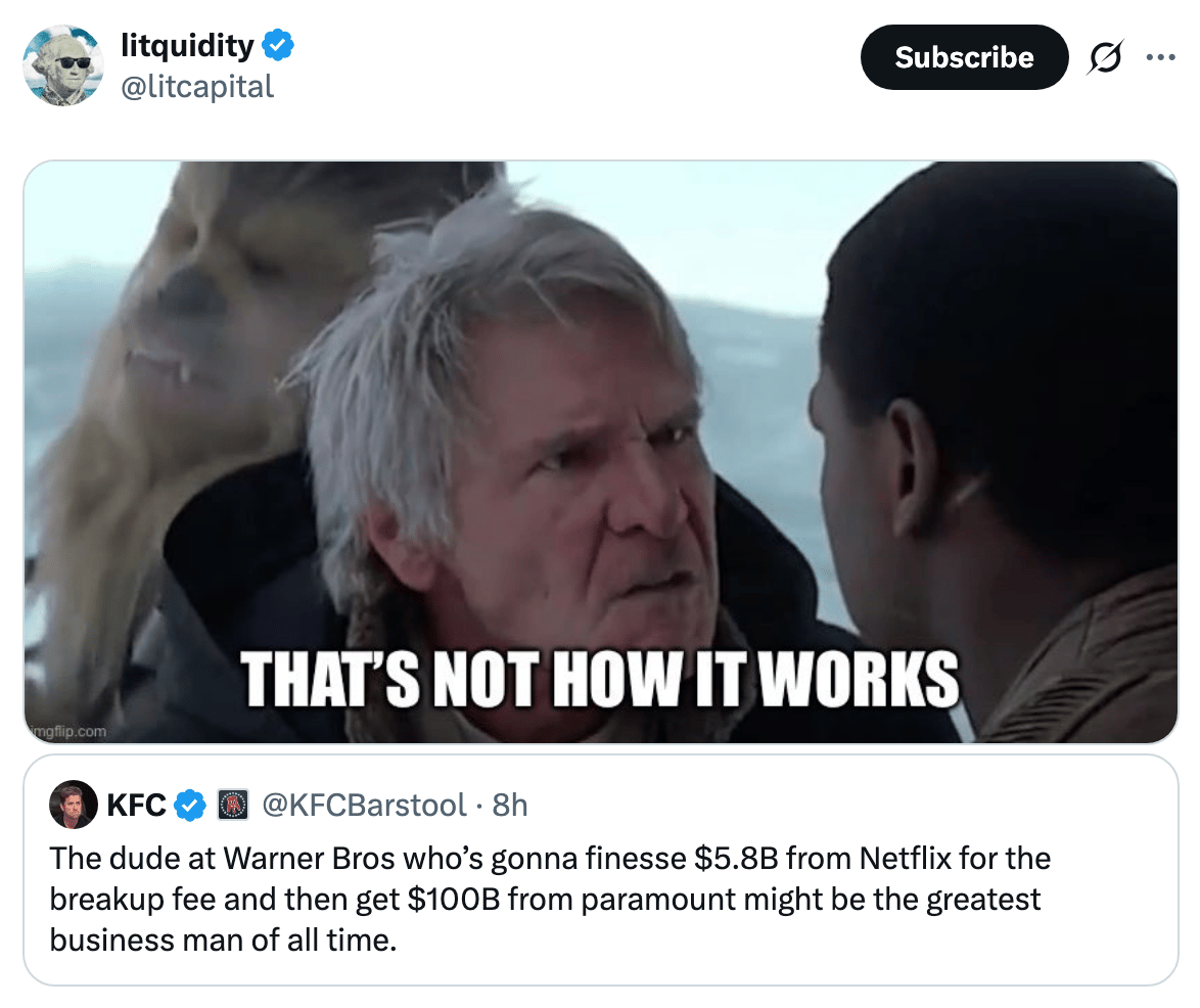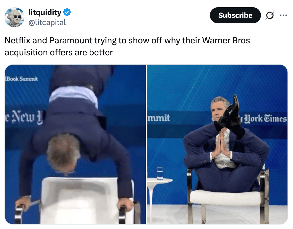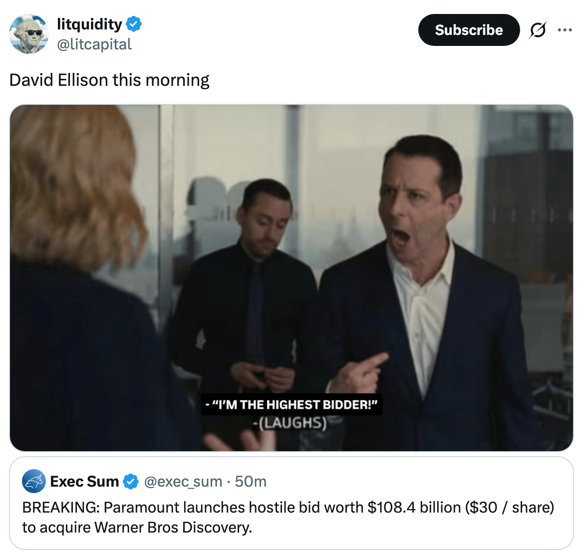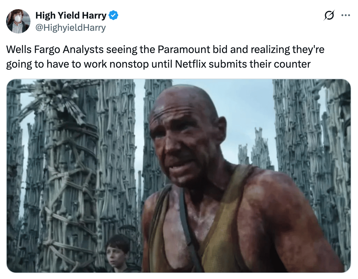 Paramount launched a $108B hostile takeover bid for Warner Bros. to challenge Netflix's deal. Our best wishes to all the TMT bankers staffed on this deal whose calendars are also victim of a hostile takeover.