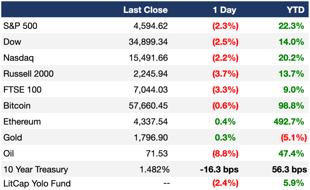 The stock market was on sale for Black Friday. All three major indexes tanked at least 2%, for their biggest one day declines in 2021, after more news of the Omicron Covid variant spooked investors (On Sunday evening, Bill Ackman tweeted that early data suggests the symptoms from Omicron are less severe but more transmissible which he believes would be bullish for the equity market and bearish for the bond market)