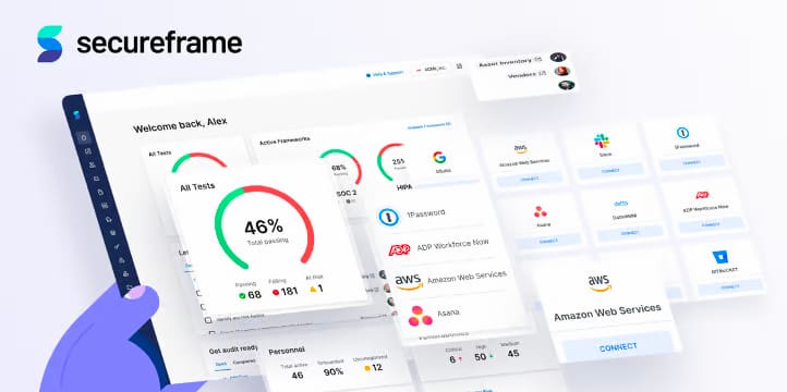 From comprehensive compliance policy templates to over 150 integrations with your core technology services, the Secureframe platform significantly increases the speed with which organizations can confidently begin a SOC 2 audit, without increasing overhead or slowing your team down.