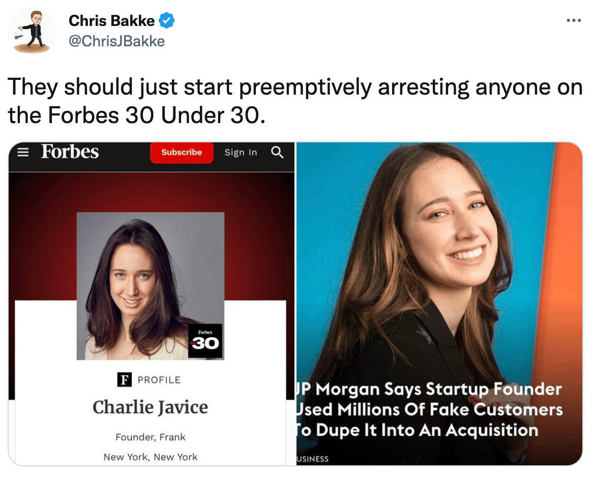 JPMorgan acquired fintech startup "Frank" for $175M, and they are now suing the startup's founder, Charlie Javice, for tricking the bank with 4M fake users. Check out the Forbes piece on this wild story.