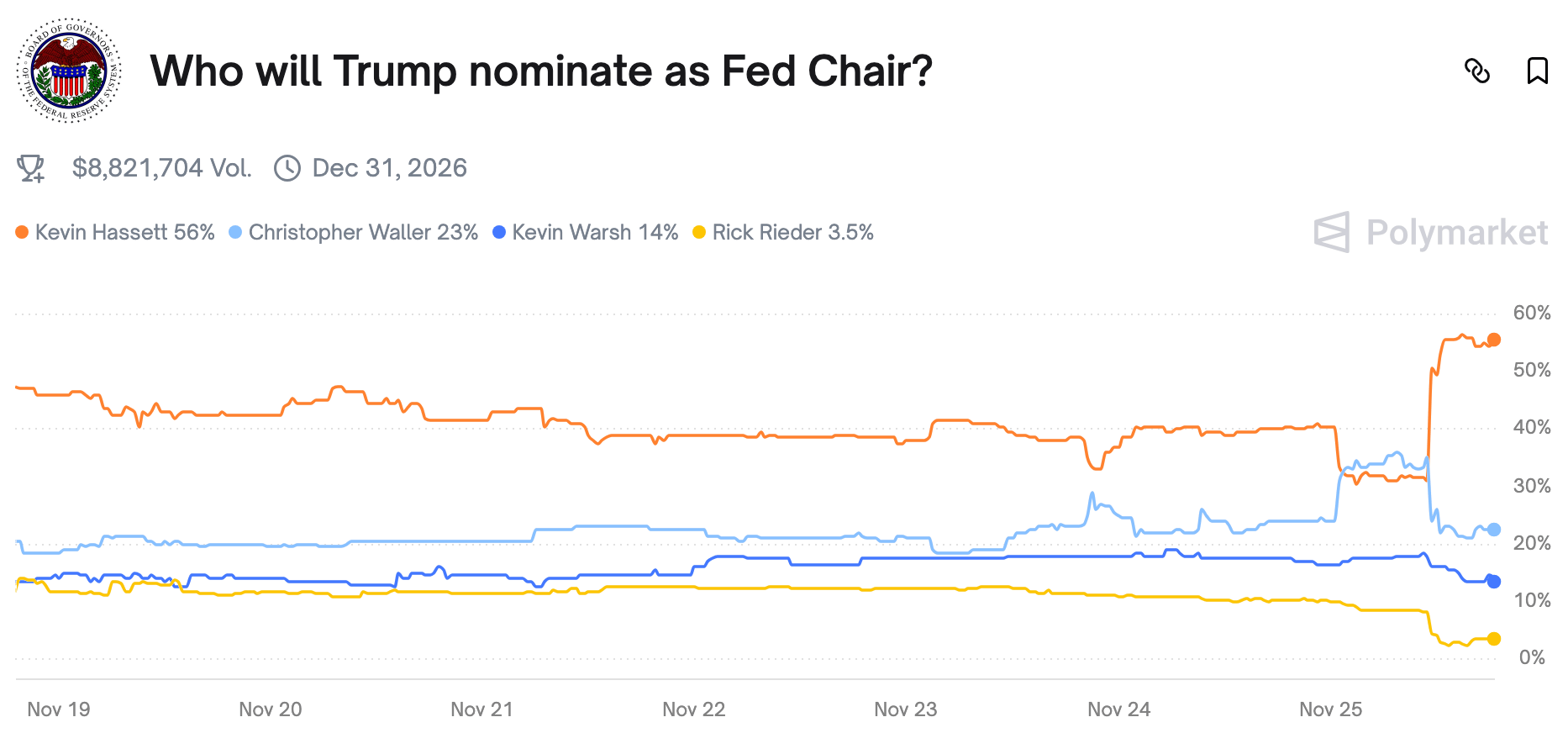 Kevin Hassett has emerged as the front-runner to succeed J Pow as Fed chair. Unless you think Trump and Bessent can identify a more loyal dove, keep an eye on Hassett’s odds.