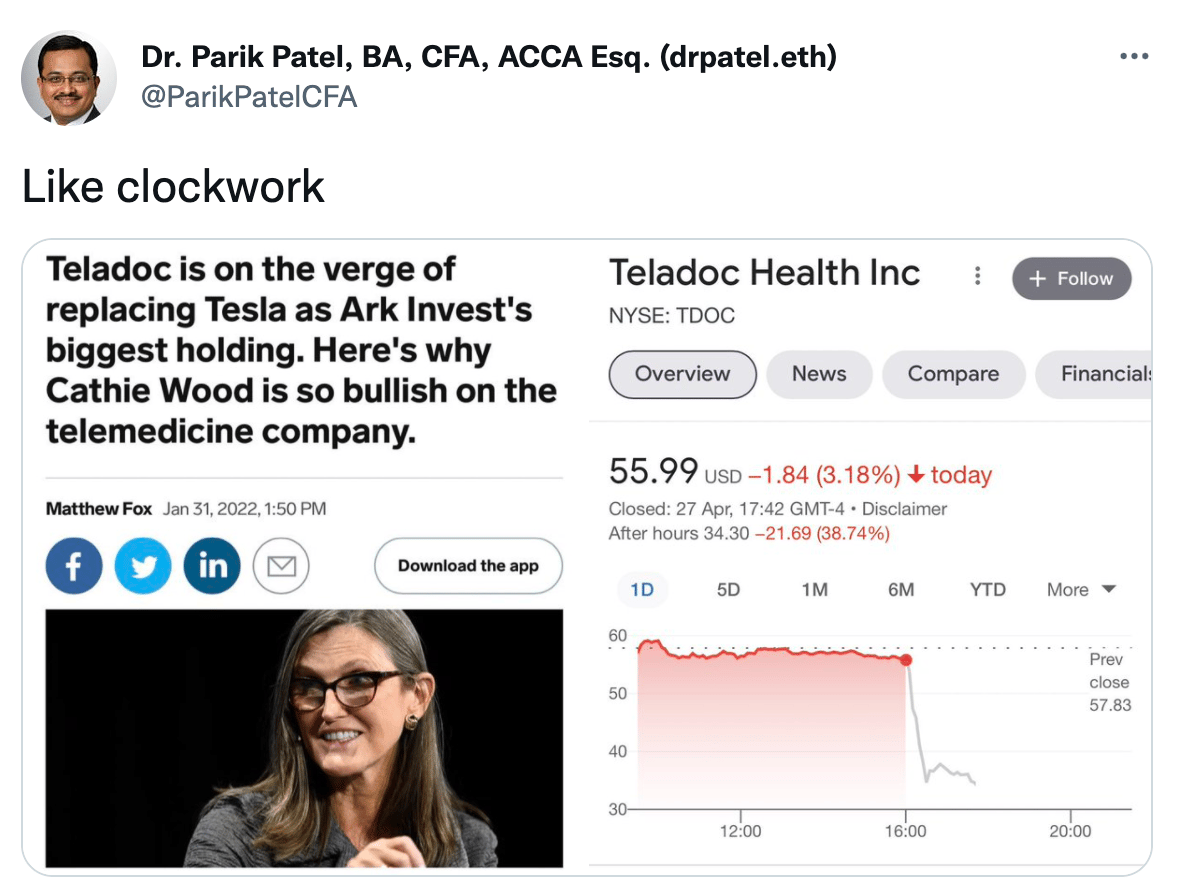 Teladoc fell 36% in AH due to lackluster revenue growth and a $41.58 net loss per share, largely driven by a $6.6B non-cash goodwill impairment charge (YHOO)