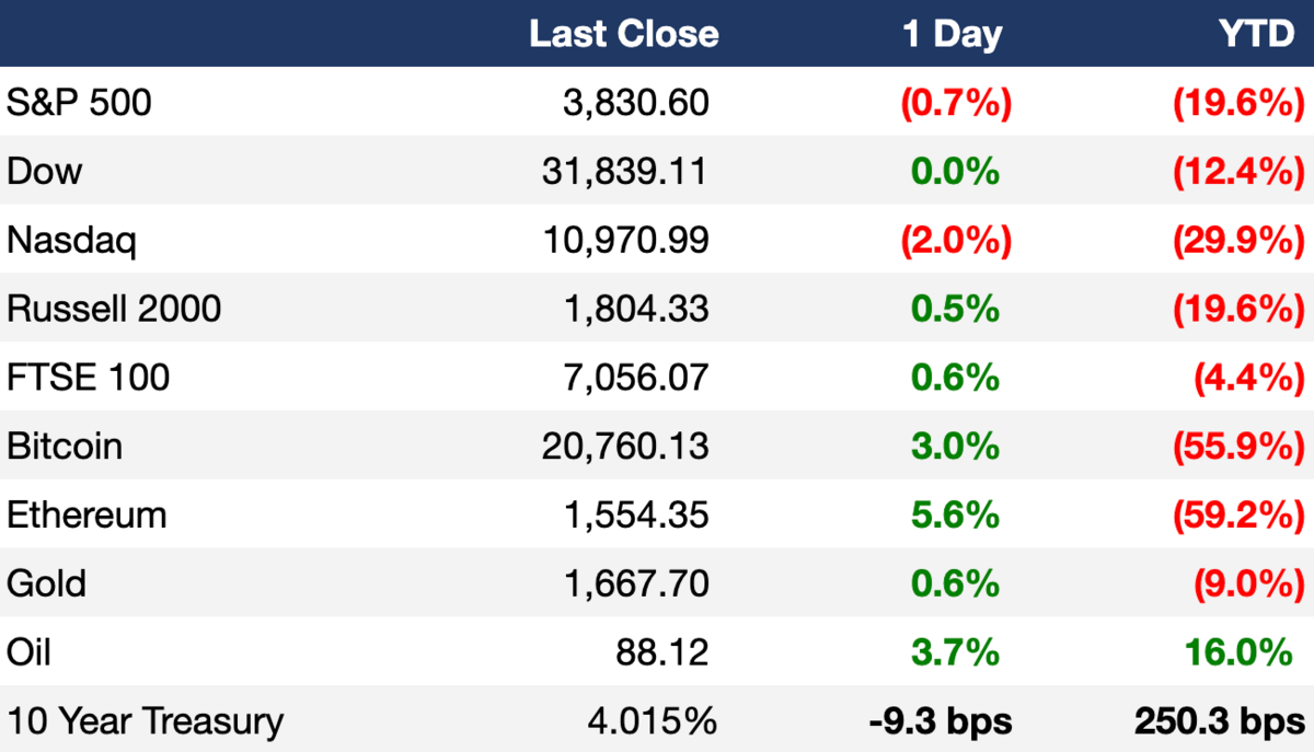 Meta fell 20% after hours on poor earnings, mortgage rates are over 7%, US auto sales are on track to rise in October, Rishi Sunak is committed to banning fracking, banks are starting to fund their debt commitments for the Twitter deal, and the DOJ is probing Tesla over self-driving claims.