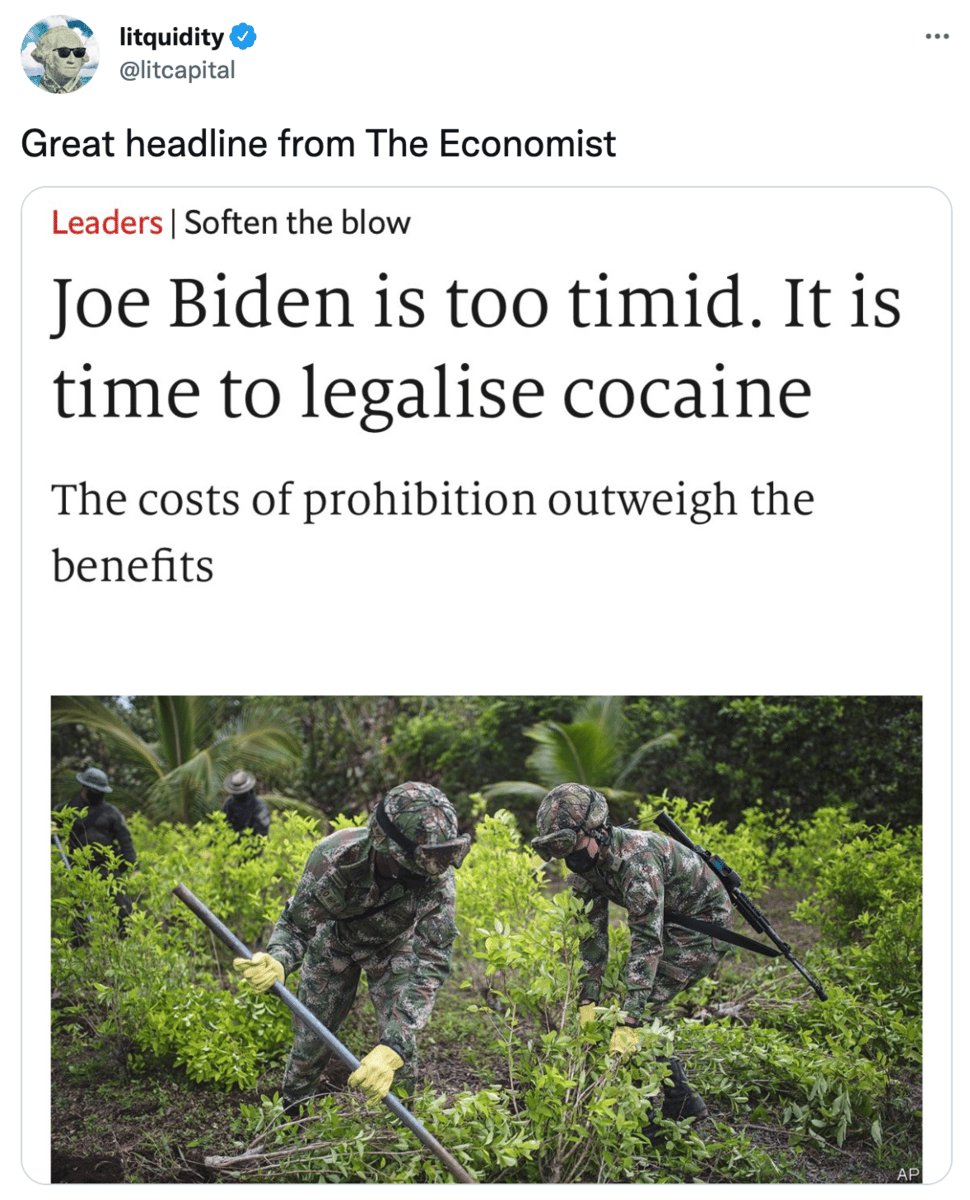 The Economist published an article saying that Joe Biden needs to legalize cocaine... and they might not be wrong? Give it a read here.