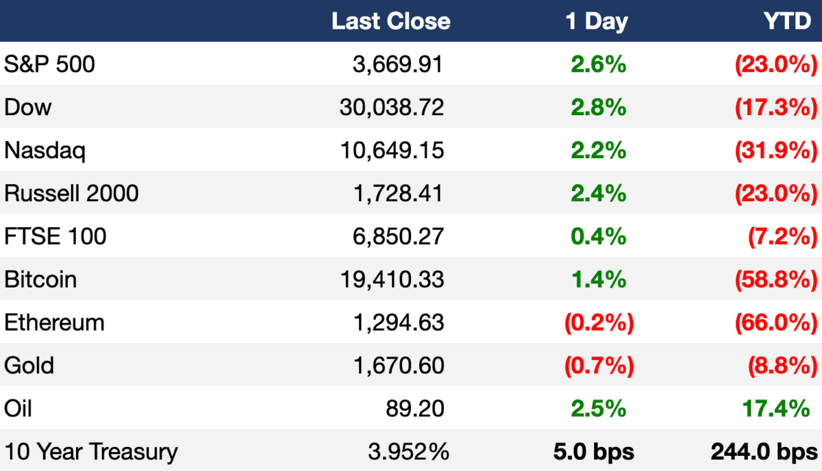 Netflix is charging $6.99 for a new ad-supported plan, inflation rose 0.4% MoM (0.6% MoM for core), 30-year mortgage rates hit a 20-year high at 6.92%, social security payments will have biggest jump in 40 years, VC firms are buying tech stocks, Apple is partnering with Goldman to offer a savings account, and Merkel has 'no ragrets' about energy policy with Russia. Pretty wild turn of events with the market opening sharply down, only to rebound on *checks notes* not so great economic news and closing sharply up!