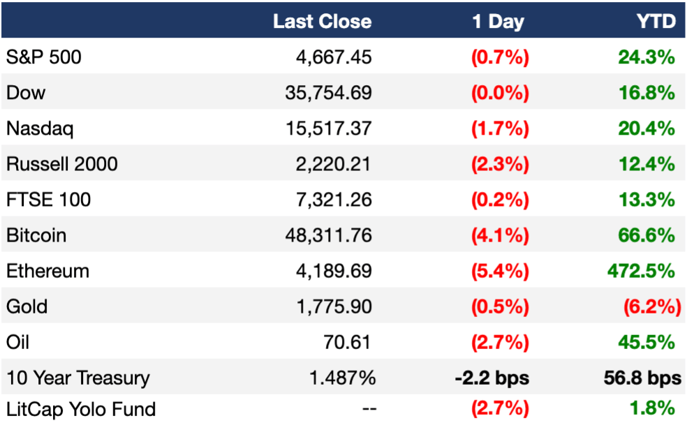 Or shall we say, "gm wagmi". Markets took a brief hiatus from mooning yesterday, with all three indexes ending slightly in the red despite jobless claims falling to their lowest level since ‘69 (nice). The reboot of Sex and the City dropped on HBO Max yesterday in time for Starbucks baristas to unionize and DeBlasio to allow for some non-citizens to vote in NYC.
