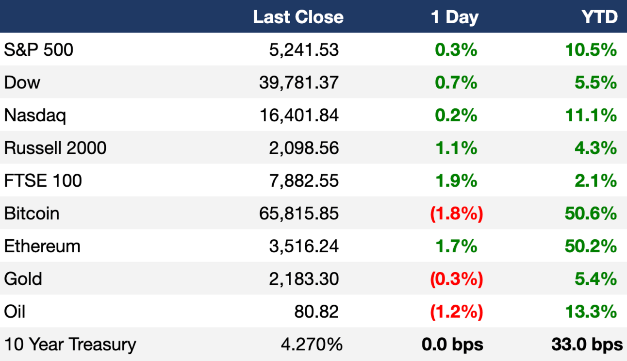 All three major US indexes closed at record highs for a second-straight day after the Fed reassured investors about prospects for 2024 rate cuts