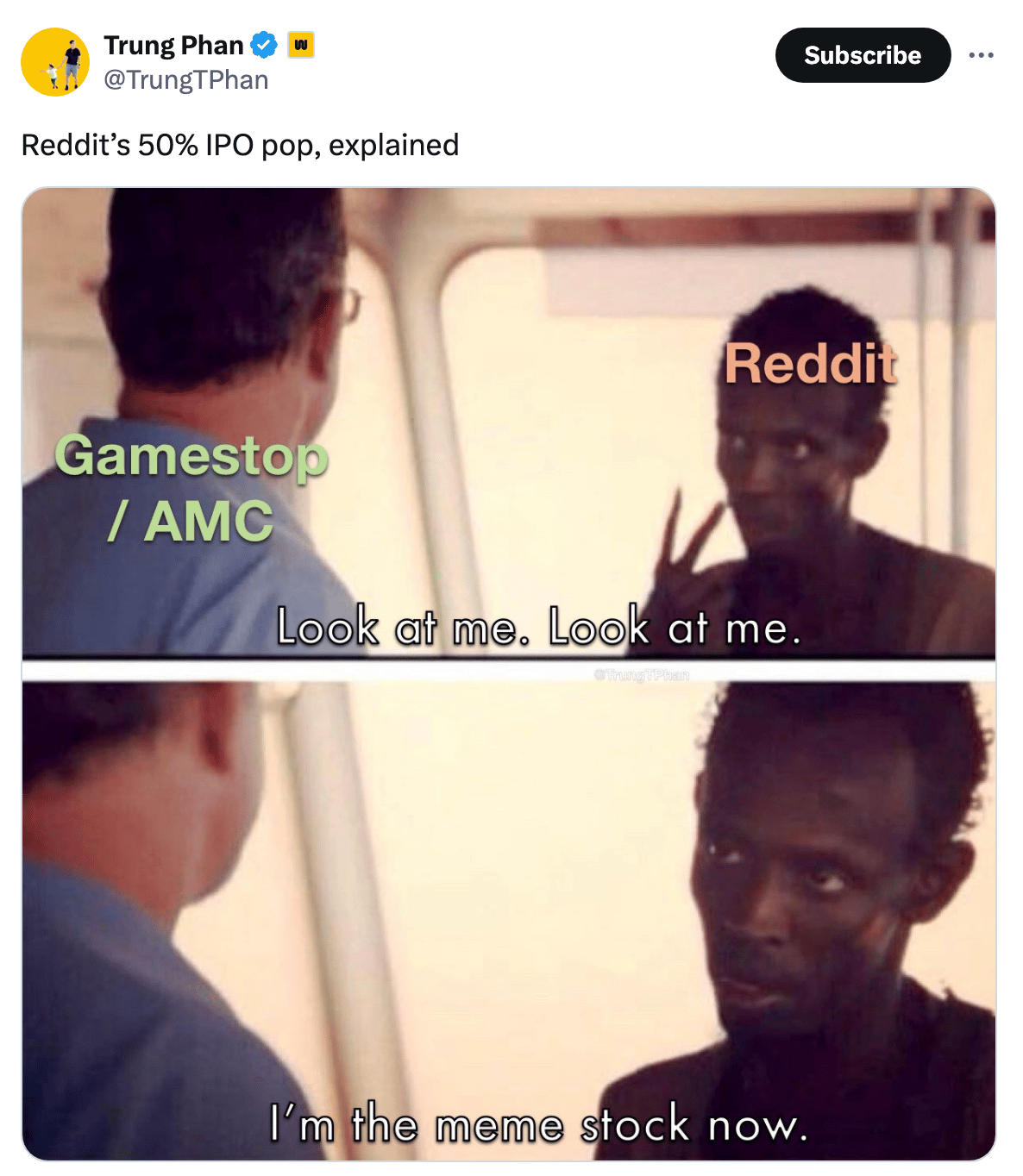 Reddit shares jumped 48% in their trading debut after its $748M IPO, giving the social media platform a market cap of ~$9.5B (CNBC)