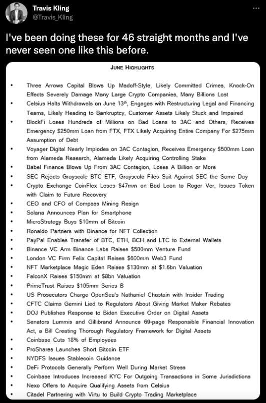 See below for a roundup of a wild June for crypto, compiled by Travis Kling, a former HF PM turned crypto fund manager: