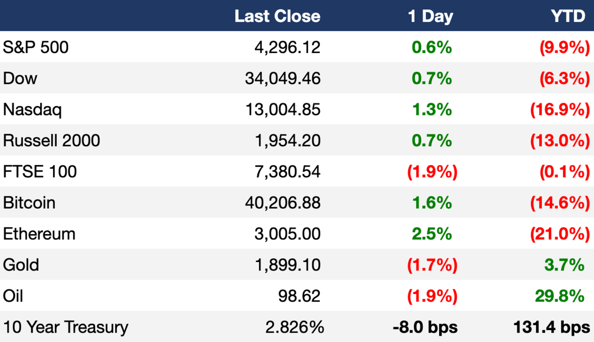 Stocks made a huge comeback in the afternoon yesterday to close in the green, with the S&P, Dow, and Nasdaq gaining 0.6%, 0.7%, and 1.3%, respectively