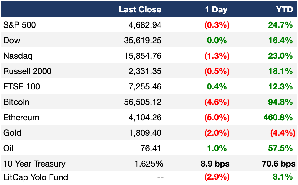The Dow edged positive, but the J Pow news and resulting rising Treasury yields sent the S&P 500 and tech-heavy Nasdaq into the red for the day