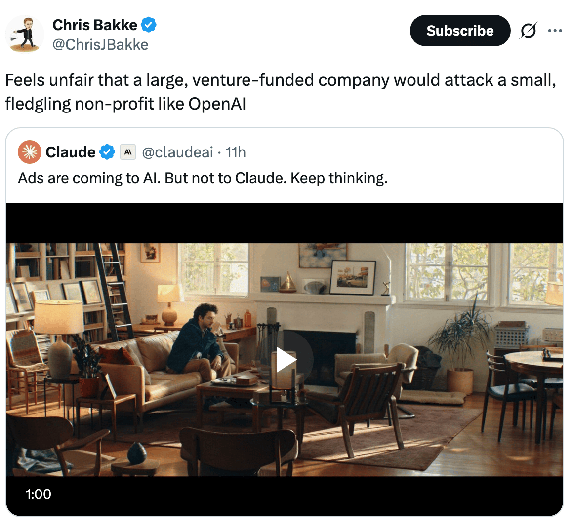 Anthropic takes aim at OpenAI in Super Bowl ad debut (WSJ)