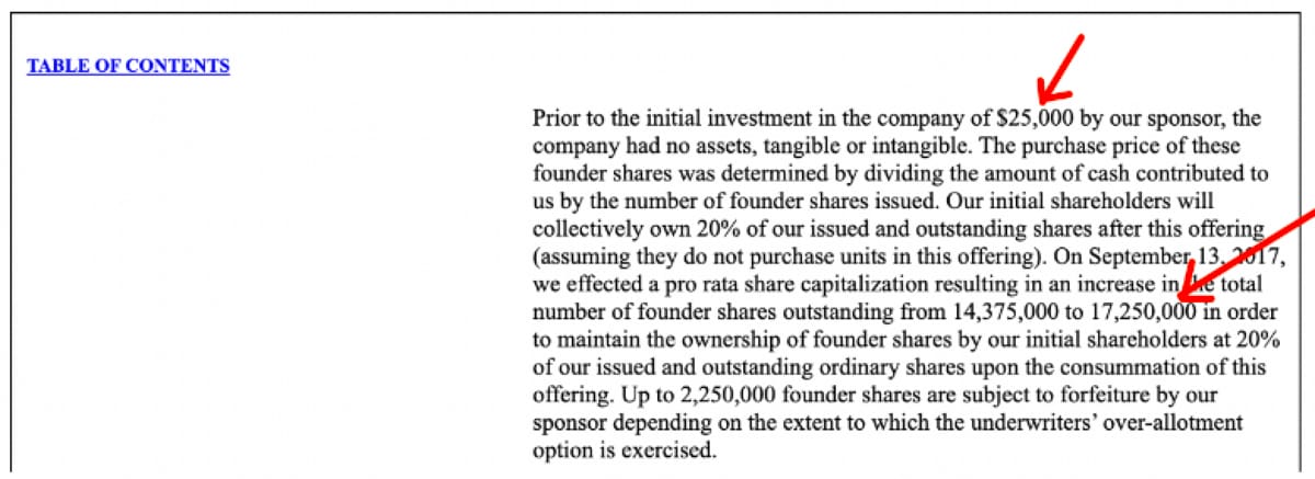 IPOA's sponsor (read: Chamath) would receive 17.25M shares of IPOA stock in exchange for his $25,000 investment in the company. Not bad!