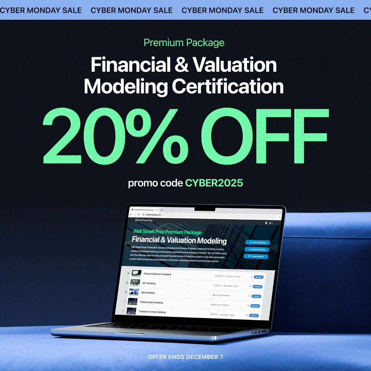 Wall Street Prep is offering 20% off their flagship Financial & Valuation Modeling Certification Program. This is the same course that Wall Street bulge brackets and elite boutiques use to train their new hires. Use code CYBER2025 before the offer expires!