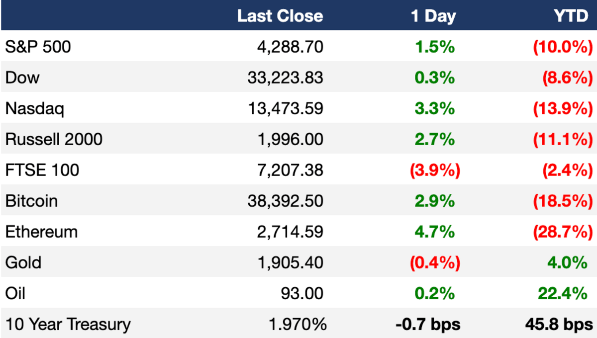 Despite the rally, the S&P is still in correction territory and the Nasdaq is in bear market territory, down 10% and 20% respectively, from recent highs